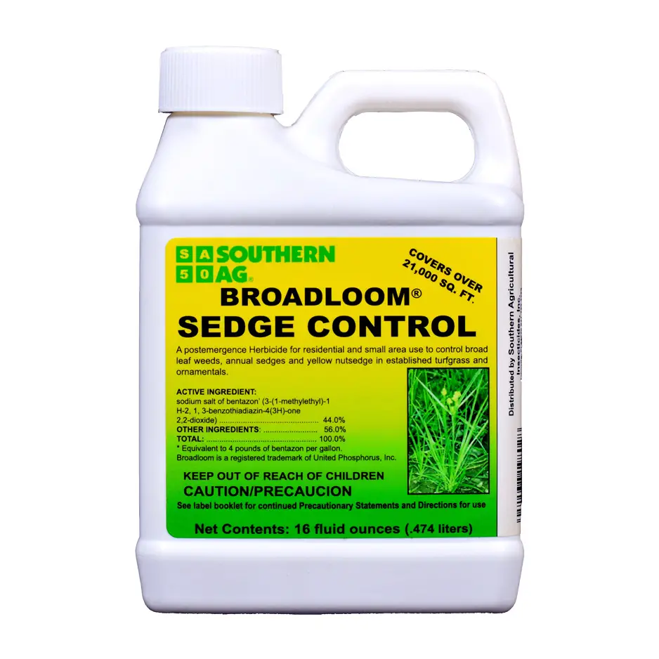 Southern Ag Broadloom Sedge Control helps control nutsedge (nutgrass) and certain broadleaf weeds in established turfgrass. It can be applied over the top on certain ornamentals and may require repeat applications for hard-to-control weeds like sedge. Use a low rate of 0.75 oz per 1,000 sq. ft., and it can be mixed with other weed killers for flexible weed management.